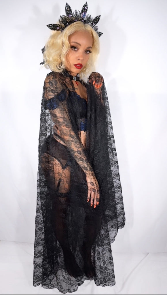 - The lace cape is just the perfect accessory needed to complete this look, embracing the inner Queen in you